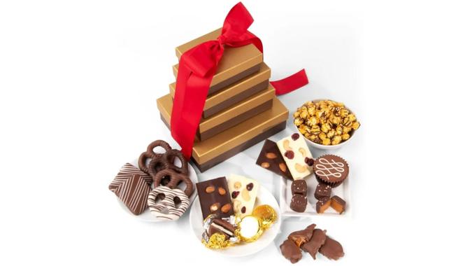 Perfect as a hostess gift or centerpiece, the chocolate indulgence deluxe gift tower is a decadent mix of milk, dark and white chocolate that will delight any chocolate lover. The beautifully gold-packaged chocolate features handmade caramel pecan clusters, Oreos, toffee, caramel corn and dark chocolate nonpareil drops.