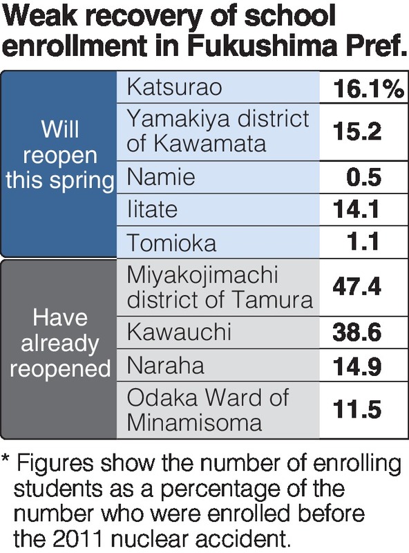 Each of the nine municipalities had been conducting classes in temporary school buildings and other places in evacuation destinations. However, following the lifting of the evacuation directives, five municipalities plan to resume school in April. These consist of four municipalities that were entirely subject to the directives -- the towns of Tomioka and Namie and the villages of Katsurao and Iitate -- and the town of Kawamata, of which only its Yamakiya district was covered by the directives.