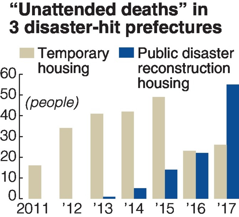 Fifty-five people died an unattended death at reconstruction housing in the prefectures of Iwate, Miyagi and Fukushima in 2017, about 2-1/2 times the number the previous year, according to prefectural police headquarters and local governments.