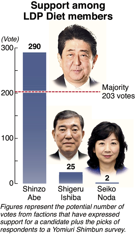 Abe has won the support of four LDP factions, including the largest bloc led by Hiroyuki Hosoda, and has the backing of 17 lawmakers from two other groups led by Wataru Takeshita and Nobuteru Ishihara, though neither group has endorsed a candidate. The prime minister also has the support of 28 members not affiliated with a faction. As a result, Abe will likely receive at least 290 votes, according to a survey conducted by The Yomiuri Shimbun.