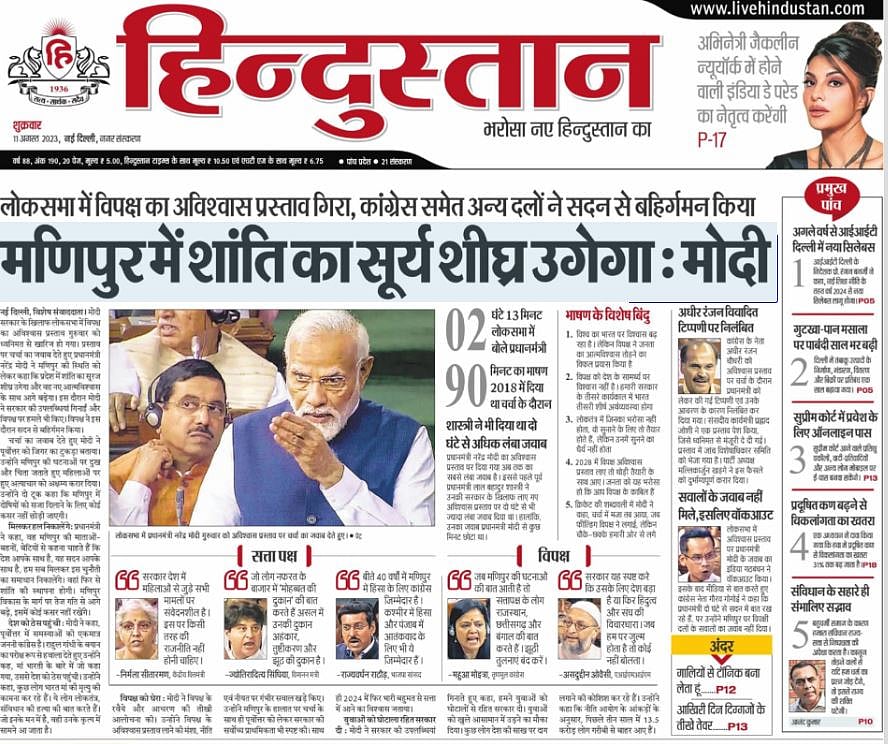 हिंदुस्तान ने लिखा कि मोदी सरकार के खिलाफ लोकसभा में विपक्ष का अविश्वस प्रस्ताव ध्वनिमत से खारिज हो गया. प्रस्ताव पर चर्चा का जवाब देते हुए प्रधानमंत्री नरेंद्र मोदी ने मणिपुर की स्थिति को लेकर कहा कि प्रदेश में शांति का सूरज शीघ्र उगेगा और वह नए आत्मविश्वास के साथ आगे बढ़ेगा. चर्चा का जवाब देते हुए पीएम मोदी ने पूर्वोत्तर को जिगर का टुकड़ा बताया. उन्होंने मणिपुर की घटनाओं पर दुख और चिंता जताते हुए महिलाओं पर हुए अत्याचार को अक्षम्य करार दिया.