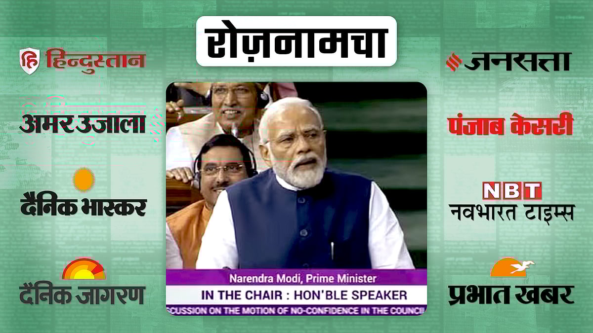 हिंदी के ज्यादातर प्रमुख अख़बारों ने आज केंद्र सरकार के खिलाफ संसद में लाए गए अविश्वास प्रस्ताव पर प्रधानमंत्री नरेंद्र मोदी के जवाब को अपनी पहली सुर्खी बनाया है. यहां तक कि प्रमुख हिंदी अख़बारों की सुर्खी का शीर्षक भी लगभग एक जैसा ही रखा गया है. मालूम हो कि अपने करीब सवा दो घंटे से ज्यादा के वक्तव्य में डेढ़ घंटे बाद पीएम मोदी मणिपुर पर बोले वो भी तब जब विपक्ष सदन से वाकआउट कर गया. भाषण में जरूर पीएम मोदी ने मणिपुर का करीब 5 मिनट तक जिक्र किया लेकि अविश्वास प्रस्ताव पर चर्चा के दौरान वहां भड़की हिंसा और वहां जाकर हालचाल न लेने के सवालों का उन्होंने कोई सीधा जवाब नहीं दिया.