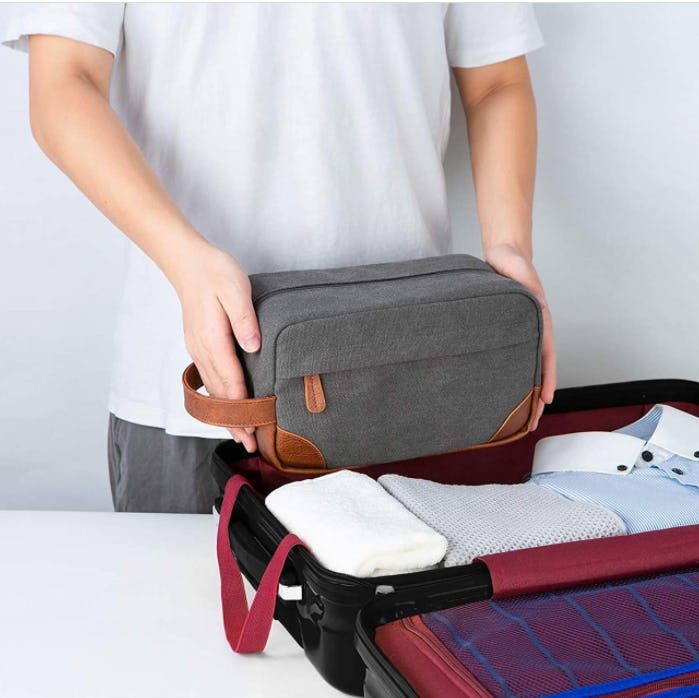 This sleek toiletry bag can fit all of your essentials — and then some. This canvas and leather bag comes in six neutral colors, is water-resistant, and can hold a massive amount despite its compact size. This bag has a 4.8-star average rating on Amazon, largely due to the three small mesh pockets inside, large inner zip-up compartment, and an exterior zipper that make organizing and storing your toiletries convenient.