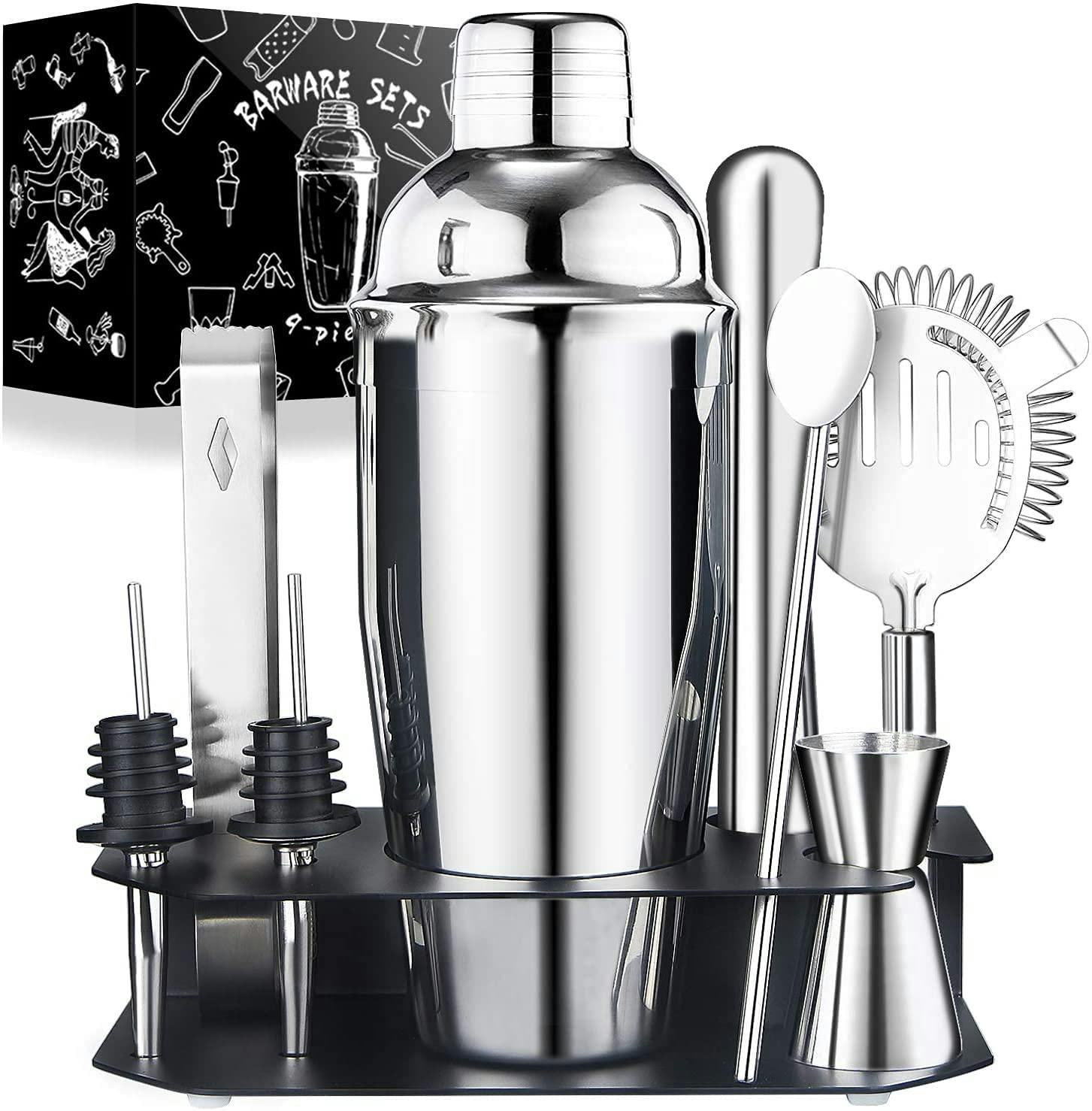 This cocktail shaker set comes with a stainless steel shaker, a jigger, a strainer, a muddler, a pair of ice tongs, a mixing spoon, and two liquid pourers, turning you into a bartender instantly. This set is easy-to-clean and the sleek storage rack will look great on any countertop or bar top.