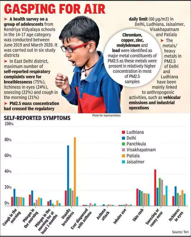 NEW DELHI: A new report, titled “PM2.5 in ecologically different districts in India: characteristics and health effects,” has revealed that around 75% of adolescents aged between 14 and 17 years in east Delhi complained of breathlessness.