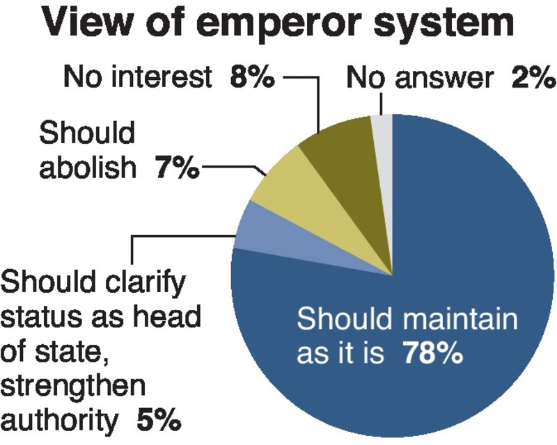 A recent Yomiuri Shimbun nationwide survey showed 78 percent of the respondents said Japan should maintain the system in which an emperor is recognized as the symbol of the state as it is now, while 7 percent said such a system should be abolished.