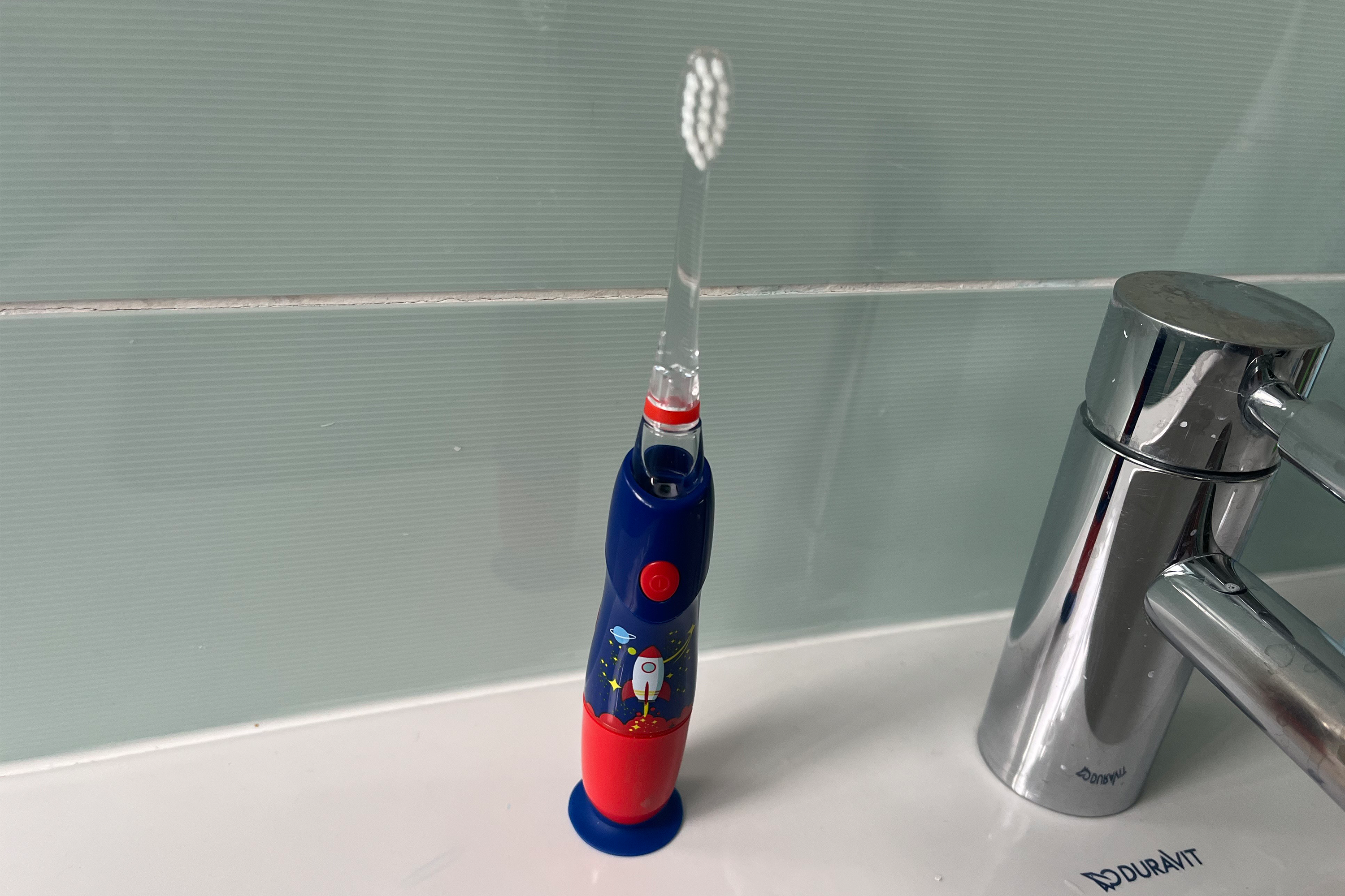 This is a colourful and fun toothbrush that will help children from age three upwards start to feel more confident and independent when brushing their teeth. We tested out the blue and red rocket design which comes with some fun features. At the press of a simple ON/OFF button the toothbrush starts flashing with green, blue and red lights as a two-minute timer begins. It was like a disco in the bathroom when we turned the lights out.