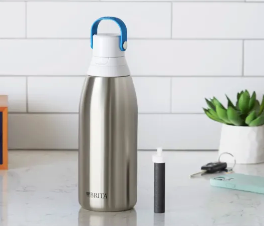 It holds 32 ounces of water, made of stainless steel, is double-wall insulated, and has a WQA Certified to “filter as you drink to reduce chlorine (taste and odor) and particulates.” The same model also comes in colorful BPA-free plastic options, should steel not be your favorite.