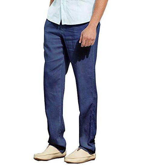Thanks to these summer pants, it's possible to get the look of denim without the added weight. This pair is made from 45% linen and 55% cotton, so it's infinitely more cooling, moisture-wicking, and breathable. Even though they feature a drawstring closure, the side and fly seams alongside the blue fabric make them look like a pair of jeans from afar.