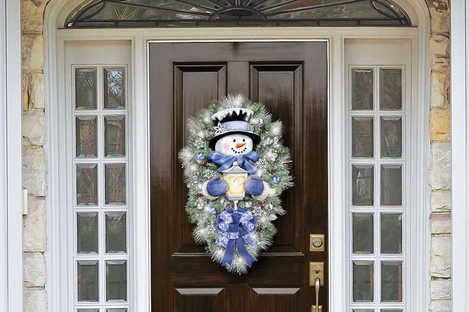Inspired by the art of Thomas Kinkade, this illuminated teardrop sconce will provide a welcoming addition to your home’s front entrance. A holiday snowman is surrounded by 26 bright LED lights which are powered by AA batteries.