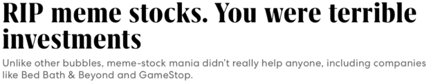 “The meme-stock bubble, though, has no real legacy [...] It'd be nice to think that, at the very least, the bubble bursting taught traders not to make reckless gambles on crappy companies, but it didn’t. Look at Bed Bath & Beyond. It may be about to go bankrupt, but its stock? Retail traders taking a wild gamble have driven it up 100% in the past three days. Some people never learn.”