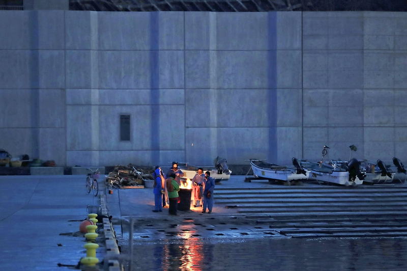 Fishermen gather for warmth around a drum fire at the water's edge as dawn breaks over Miyako Port in Miyako, Iwate Prefecture, on Wednesday. Behind them towers a 10.4-meter-high coastal levee built in the wake of the 2011 Great East Japan Earthquake. The tsunami that followed the quake swept away the fishermen's oceanside storage huts, forcing them to carry their poles and other equipment from home each day. "The huts are gone, so now we gather outside to watch the waves and listen to the sounds of the ocean before deciding when to set out," said one of the fishermen.