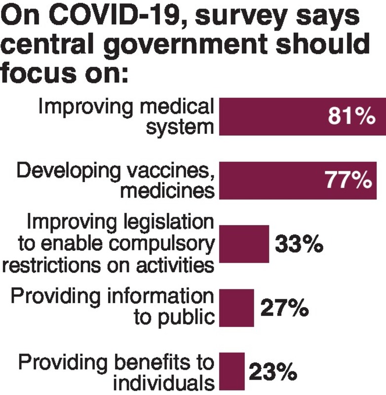 The survey asked respondents to select up to three from nine options regarding measures the government should focus on to handle COVID-19 and 81% selected "improving the medical system," closely followed by 77% who chose "developing vaccines and therapeutic medicine."