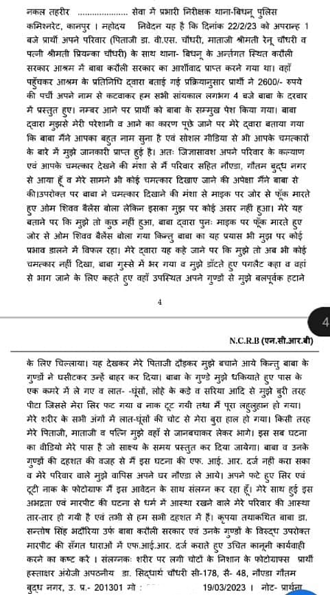 वहीं इस मालमे पर सिद्धार्थ के चाचा सुरेंद्र चौधरी कहते हैं, “हमने जो एफआईआर कराई है. वह बिल्कुल सही है. सिद्धार्थ ने सिर्फ अपनी समस्याओं का समाधान पूछा था. उसने कहा था कि पारिवारिक समस्याएं हैं. पिता की तबीयत खराब रहती है. घर में सुख शांति के लिए आपके पास आया हूं आशीर्वाद चाहिए. आप सबको चमत्कार दिखाते हैं, मुझे भी दिखा दीजिए. जैसे सब फील कर रहे हैं, मैं भी ऐसे ही फील करना चाहता हूं.”