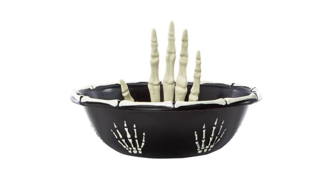 Put a bone-chilling spin on this year’s candy bowl with an inexpensive skeleton bowl. Each bowl comes with a skeleton hand you attach by twisting it into the bowl and bony detailing on the bowl’s rim.