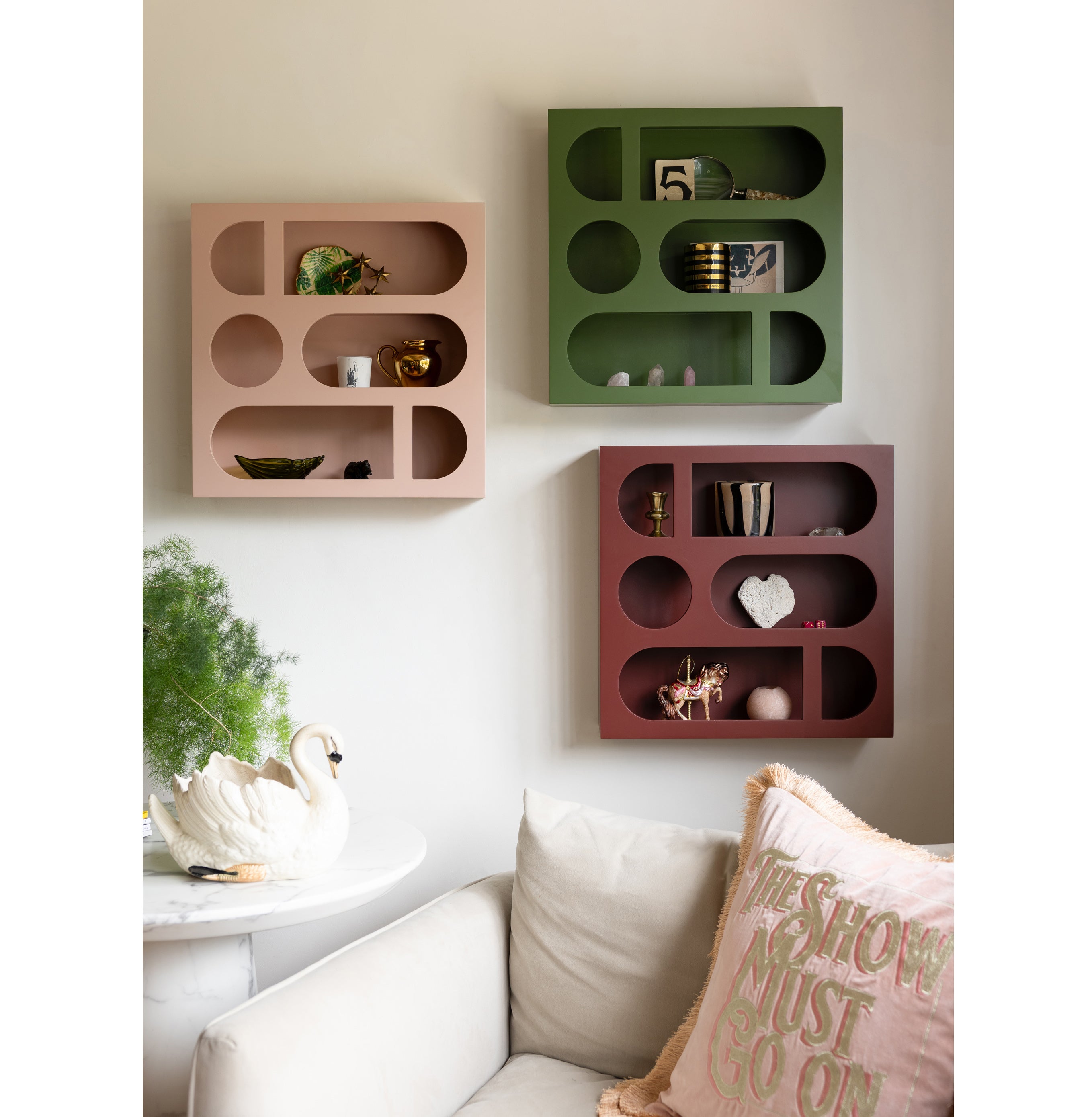 3. Alcove Wall Shelf in Dusty Pink (left); Cactus Green (right); Burgundy, (bottom), £95 each, Rockett St George