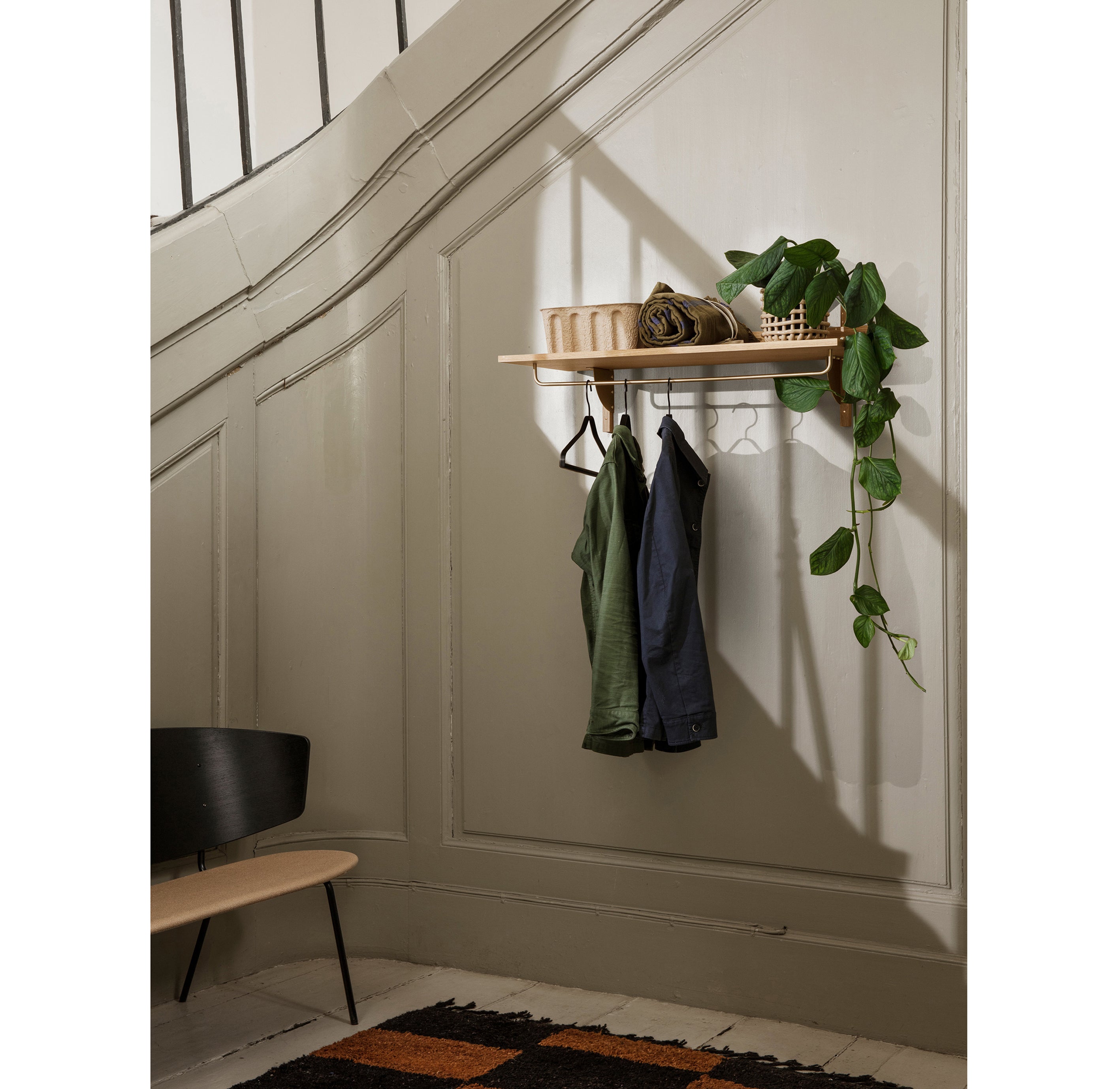 Hallways can often bear the brunt of all that outerwear messiness… parkas, beanies and gloves, not to mention a brolly or two. Step in this rack shelf with ample room for hangers, a basket for everyday items (from a dog lead to woolly scarf) – and strong enough (can hold 20kg) for heavy winter coats.