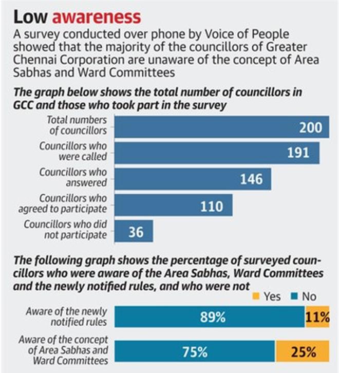 A survey conducted by Voice of People (VoP), a citizens’ collective, showed that around 90% of the Greater Chennai Corporation (GCC) councillors who took part in the survey were unaware that the Tamil Nadu government has notified rules for the formation of Area Sabhas and Ward Committees.