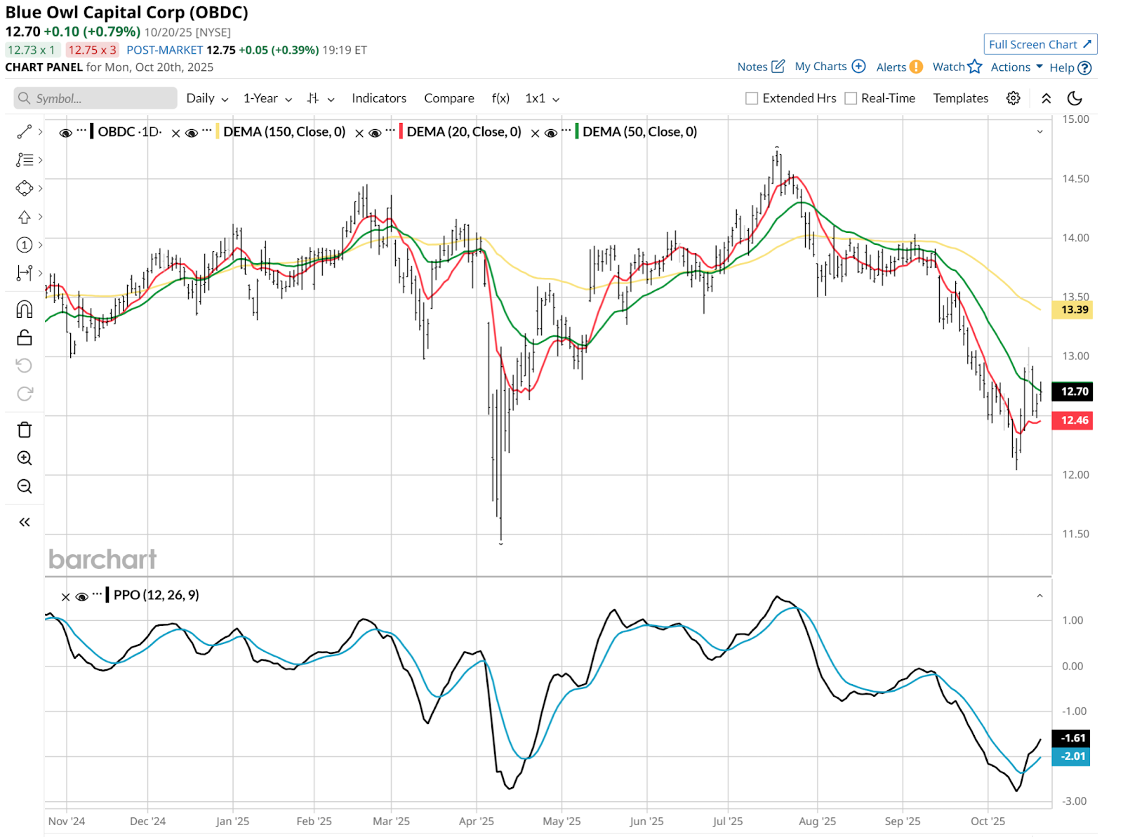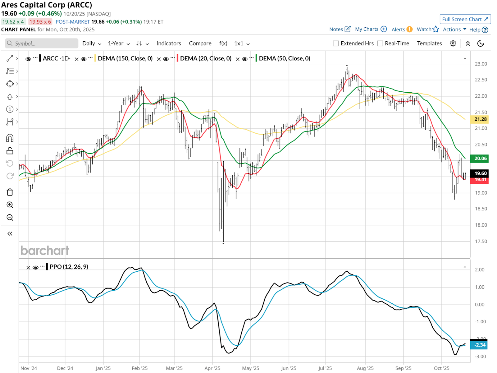 The eight holdings below (the first one listed as “N/A” is mostly U.S. T-bills) make up more than half of BIZD’s assets. And just three giants among those account for 36%. So let’s chart them and see if they point to any directional signals for this ETF and the private capital industry as a whole.