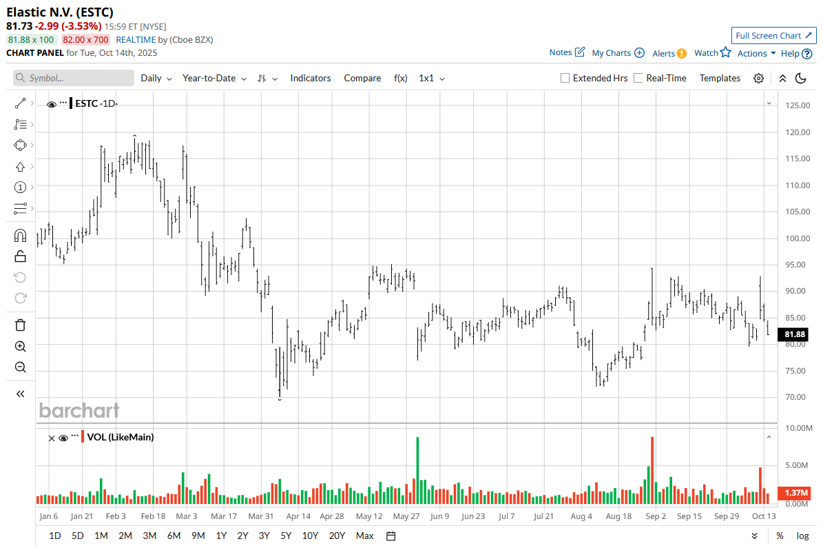 Elastic shares ranged between $70.14 and $118.84 within the previous 52 weeks and recently traded around $82, down some 30% in recent weeks from their year-high. Year-to-date (YTD), ESTC remains modestly negative in comparison with the S&P 500 Index ($SPX), which has gained approximately 11% during the comparable time frame. Nonetheless, its 3% gain in the prior five days signals renewed purchasing power following strong financials and capital-return news.