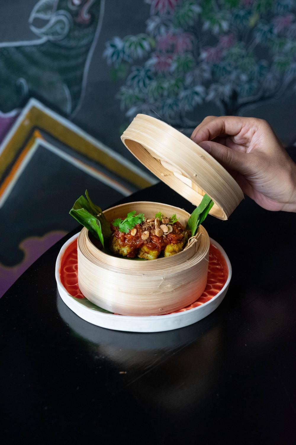Appetisers begin with the Stormy sea, a dish inspired by a Chanthaburi fishing trip, consists of squid, mangosteen and chilli. The Chicken rice dish is a curry with crispy rice and wild herbs. The curry is blended with lots of aromatics and cooked in a clay pot for maximum flavour. Pickled mulberries and sliced chills complete the dish.