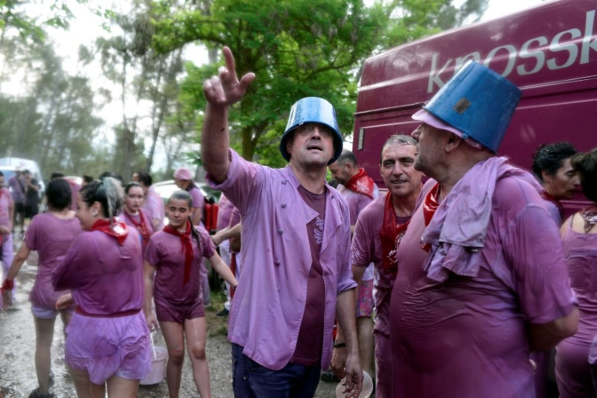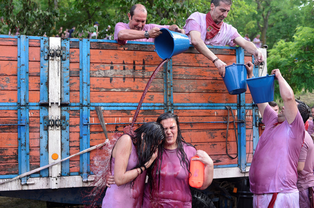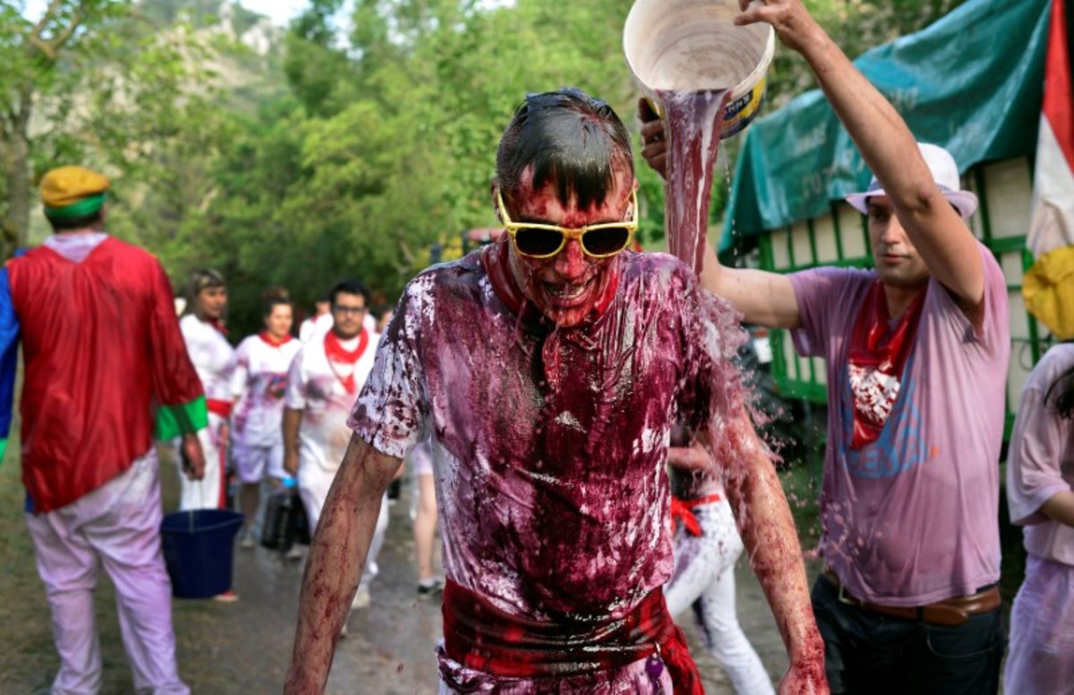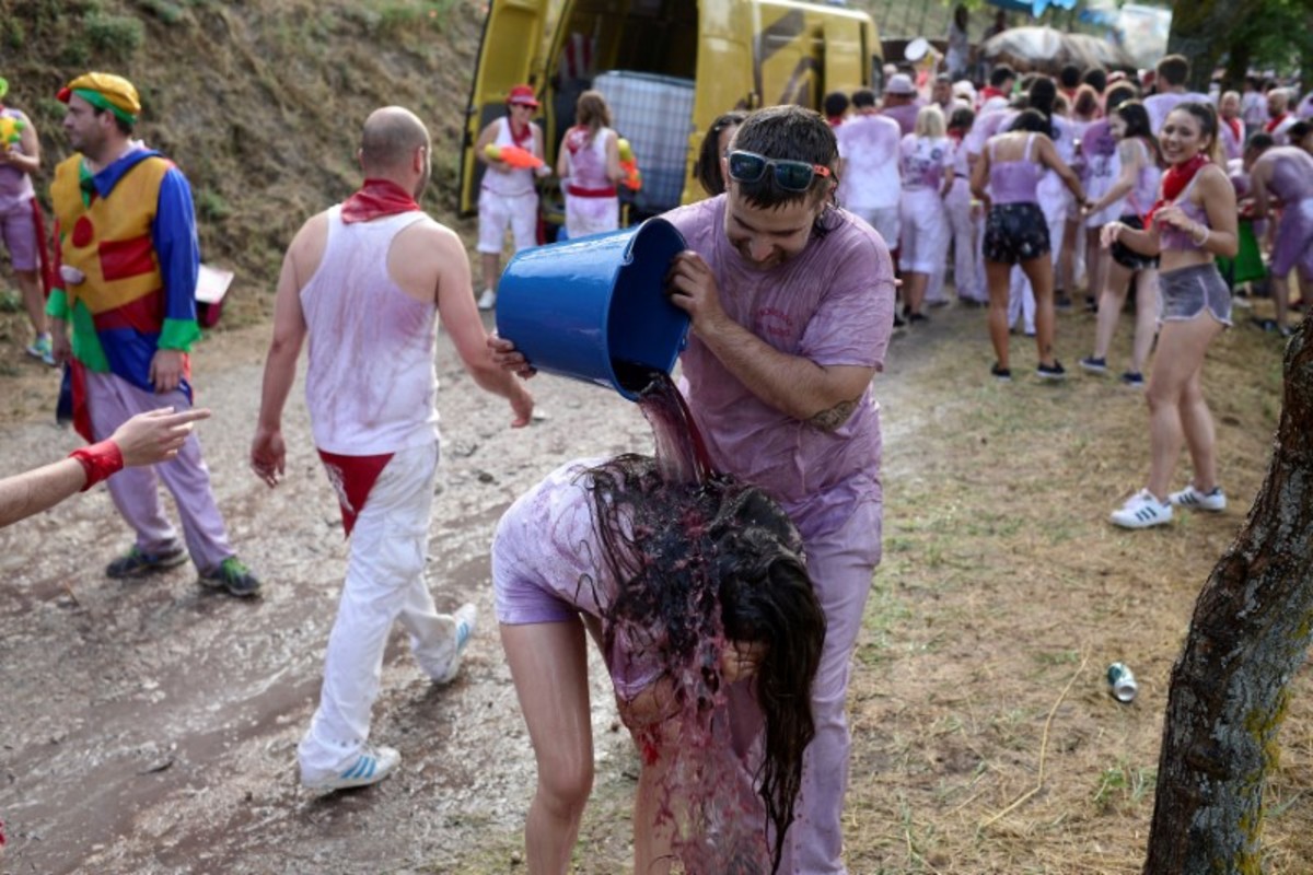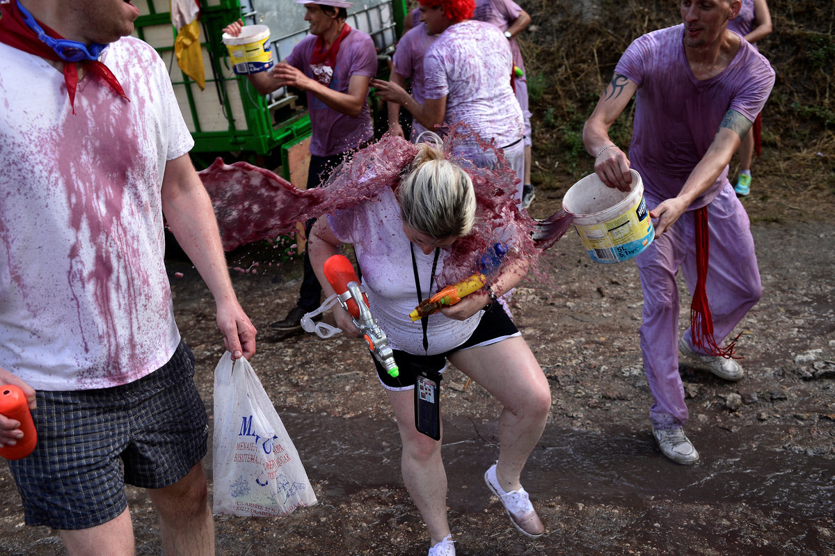 A reveller has wine poured over him during the Batalla de Vino (Wine Battle) in Haro, Spain, June 29, 2018. REUTERS/Vincent WestRevellers have wine poured over them during the Batalla de Vino (Wine Battle) in Haro, Spain, June 29, 2018. REUTERS/Vincent WestA reveller throws a bucket of wine during the Batalla de Vino (Wine Battle) in Haro, Spain, June 29, 2018. REUTERS/Vincent WestRevellers wear buckets on their heads during the Batalla de Vino (Wine Battle) in Haro, Spain, June 29, 2018. REUTERS/Vincent WestRevellers have wine sprayed at them during the Batalla de Vino (Wine Battle) in Haro, Spain, June 29, 2018. REUTERS/Vincent WestA reveller has wine poured over her during the Batalla de Vino (Wine Battle) in Haro, Spain, June 29, 2018. REUTERS/Vincent WestA reveller has wine thrown at her during the Batalla de Vino (Wine Battle) in Haro, Spain, June 29, 2018. REUTERS/Vincent West