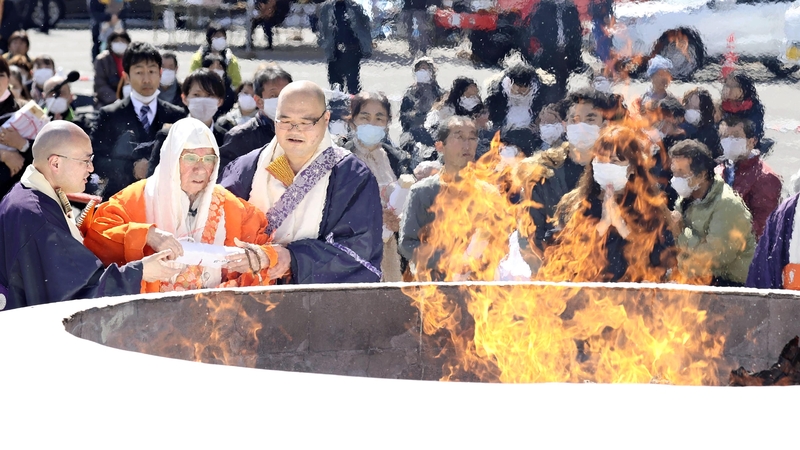 The temple's monks, including high-ranking Kokei Oki, 95, threw more than 100,000 sacred wood sticks into the fire to pray for world peace and the end of the new coronavirus pandemic.