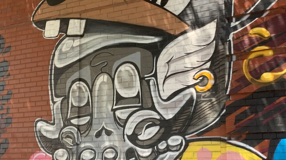 Jeff Pak, who was one of the more experienced muralists involved in the project, painted a blue-and-pink wolf that stands, arms crossed, tongue out, a patch covering one eye.
