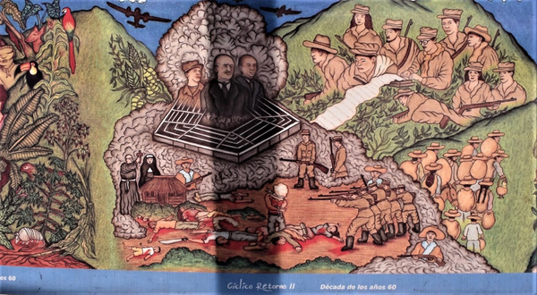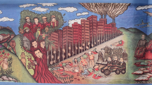 The camp's piece de resistance is a sweeping 12-part mural that tells Colombia's turbulent history, complete with guns and gore, and menacing figures emerging from the U.S. Pentagon and a nuclear mushroom cloud amid Vietnam war imagery.