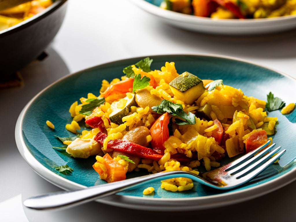 Paella is a traditional Spanish dish: it’s showy, versatile and feels like a celebration every time. It’s served right in the pan with a vibrant array of veggies, meat and seafood. While it’s often made with short-grained bomba rice, arborio rice is easier to find and holds up well in paella, too.