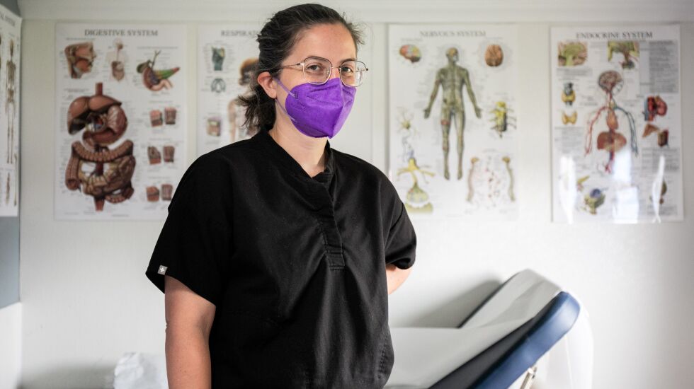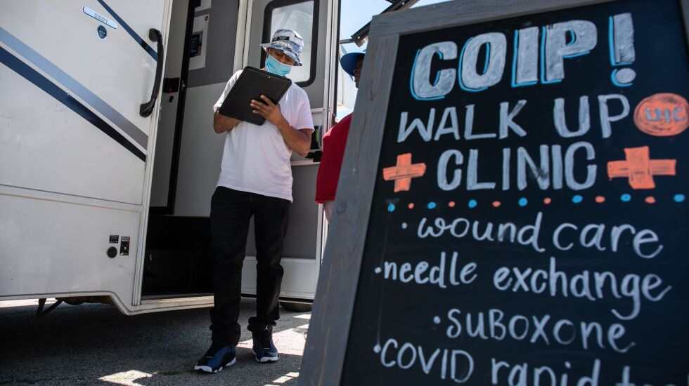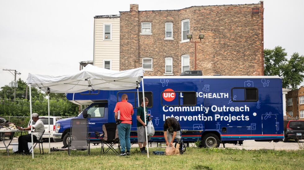 The converted RV, with the UIC logo on the side, is designed as a primary care clinic. That means it can offer first aid, as well as nonemergency services, such as pregnancy screenings or COVID-19 tests. The main cabin serves as a patient intake room; the rear cabin as an exam room. Staff include a physician, pharmacist, intake specialist, outreach worker and driver.