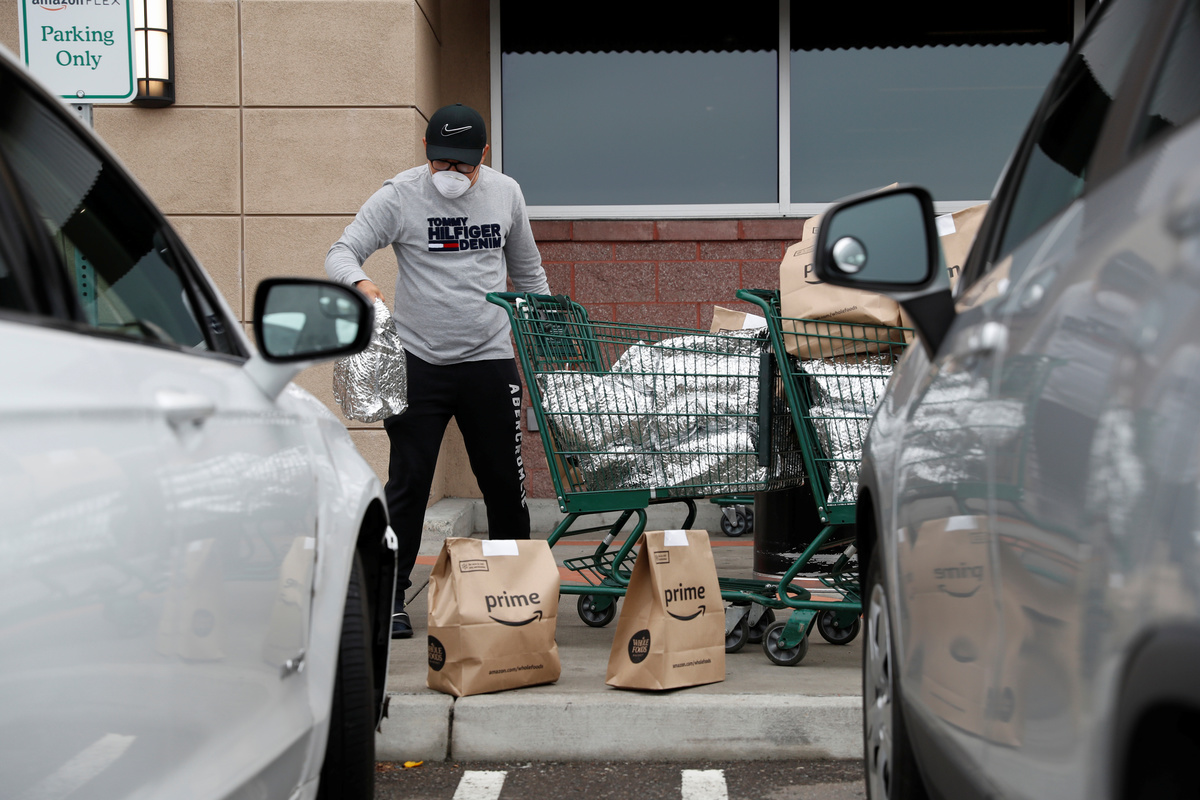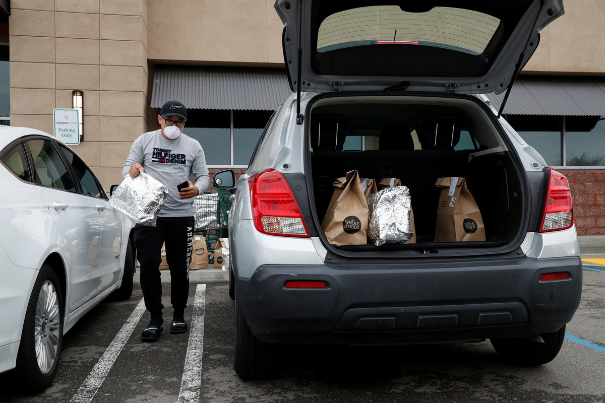 Donning a white face mask, Sabulao towed two shopping carts overflowing with brown paper bags that were stamped with a logo for Amazon's loyalty club Prime. He started loading his car in a parking spot for Amazon Flex, a program that lets contractors like himself sign up for delivery times with their own vehicles. He quickly filled up the trunk and began lining bags and other packages along the back seat of his car.
