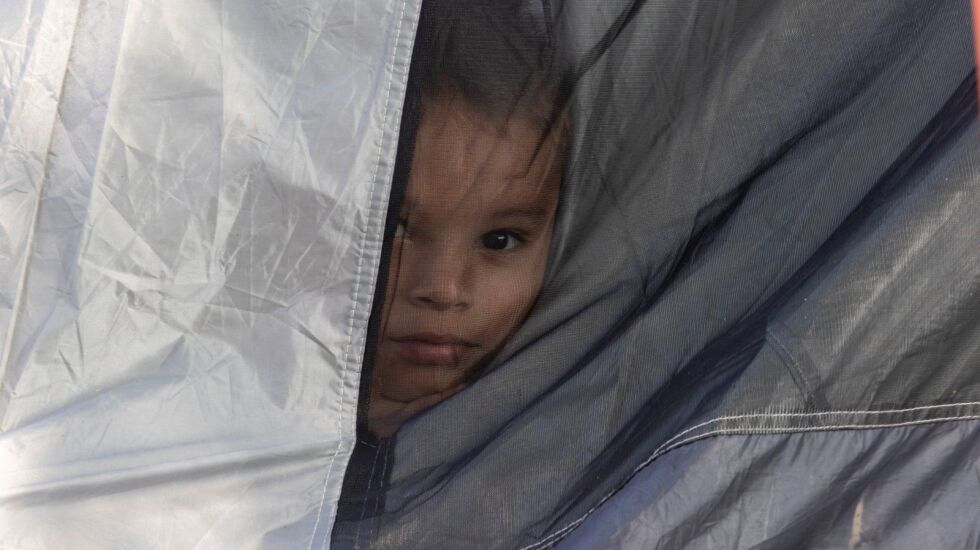 Outside the 12th District station, new arrivals have created a community of their own. A rug laid out on the grass at the entrance to the tents marks an informal gathering space where people sit and talk. An unplugged refrigerator gets filled with ice to keep food cold. One of many children living there for now abandons a ball after it rolls across a busy street and comes to a stop under a parked car.