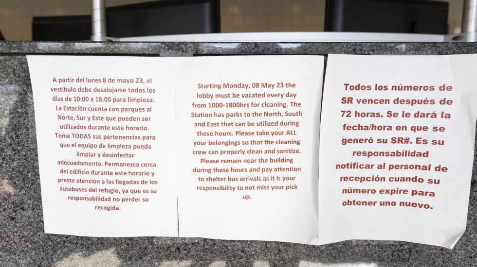 Migrants sleeping inside the police station say they feel they have little choice but to be tied to the location when they don’t know when a bus might arrive for a city shelter.