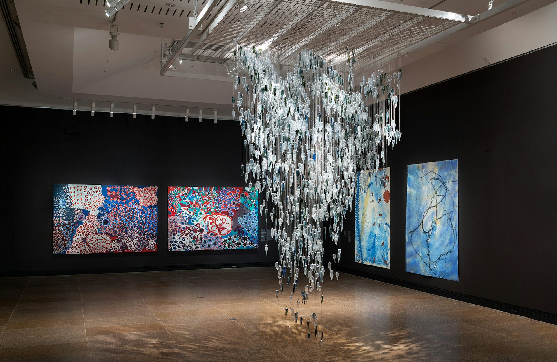 On entering the exhibition space, viewers are confronted by Kokatha/Nukunu artist Yhonnie Scarce’s extraordinarily impressive recreation of an atomic mushroom cloud in Thunder raining poison (2015), made of 2,000 suspended glass yams.