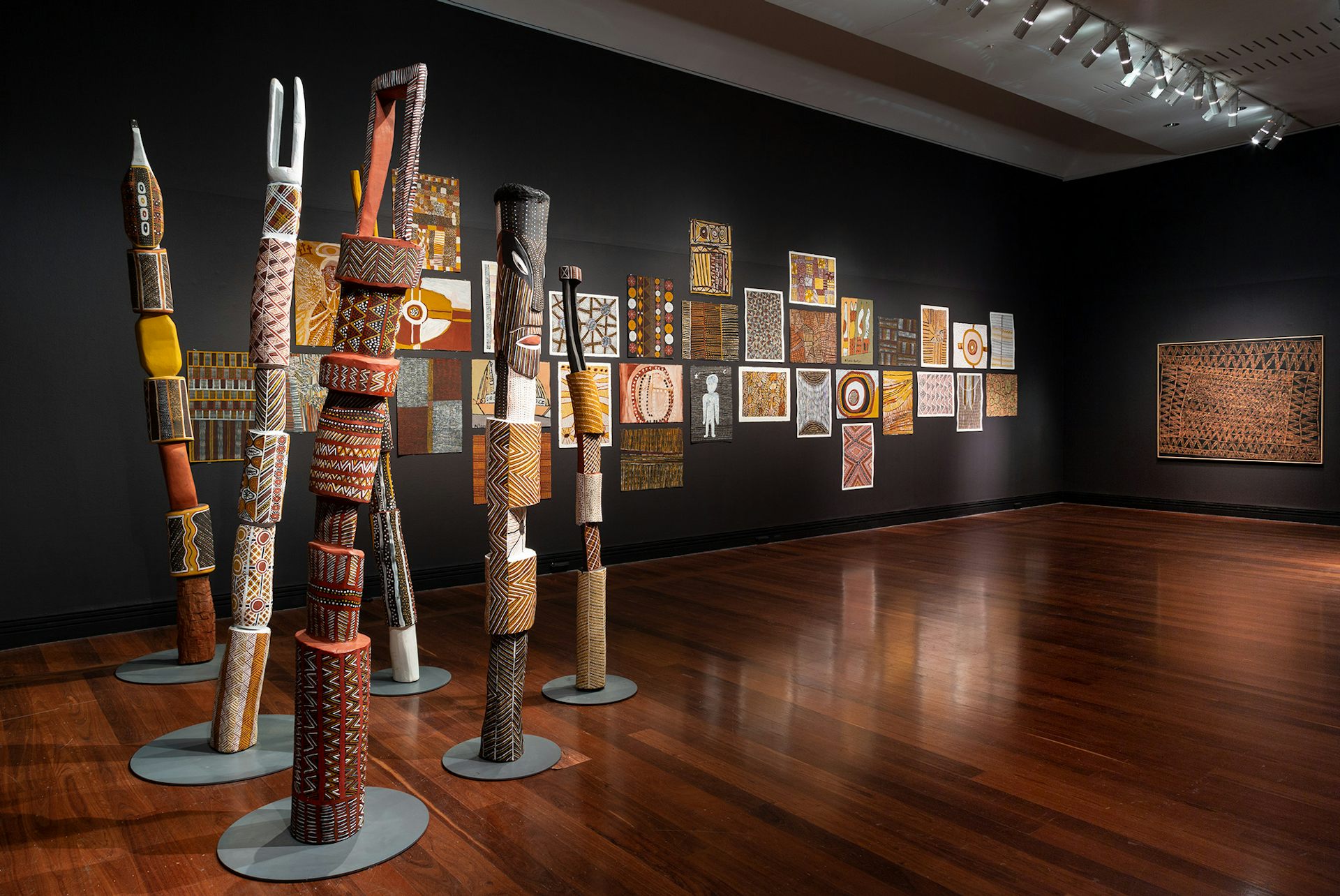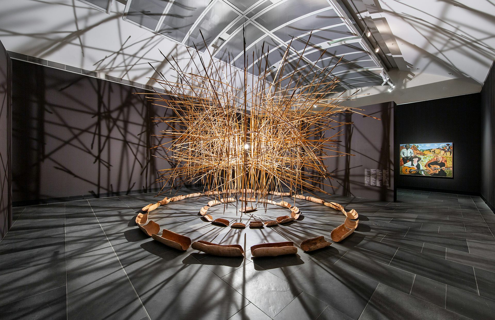The magnificent Ngarrindjeri weaving Eel trap (2015) by Yvonne Koolmatrie hovers, suspended in the air, its size giving gravity and importance to a functional vessel widely used for catching eels. Its considered design ensured restricted numbers of eels would be caught, preserving the eel population.