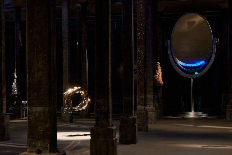 As we find our bearings in relative darkness, sculptures and installations suddenly appear, as if for our eyes only. Upon approaching the works, we suddenly perceive reflected shadows that often merge with our own. A cat is hiding in one corner; a spider is just above us.