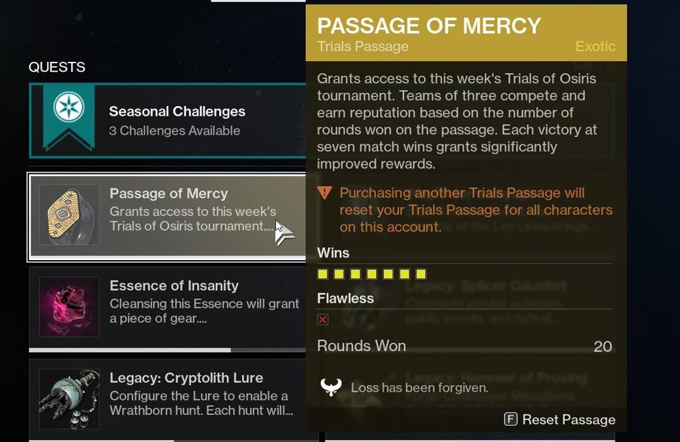 Trials cards no longer count losses, and will count up to 7 wins and 20 rounds won. The rounds won stat plays into Trials reputation, 5 points per round won, so at 20 rounds won on a card, that’s why you’re getting 100 rep per patch, win or loss. That’s an engram every 3-6 games or so, depending on your rank. If you reset that, it will go all the way back down again and you’ll have to start building back up to 20. So that’s not great.