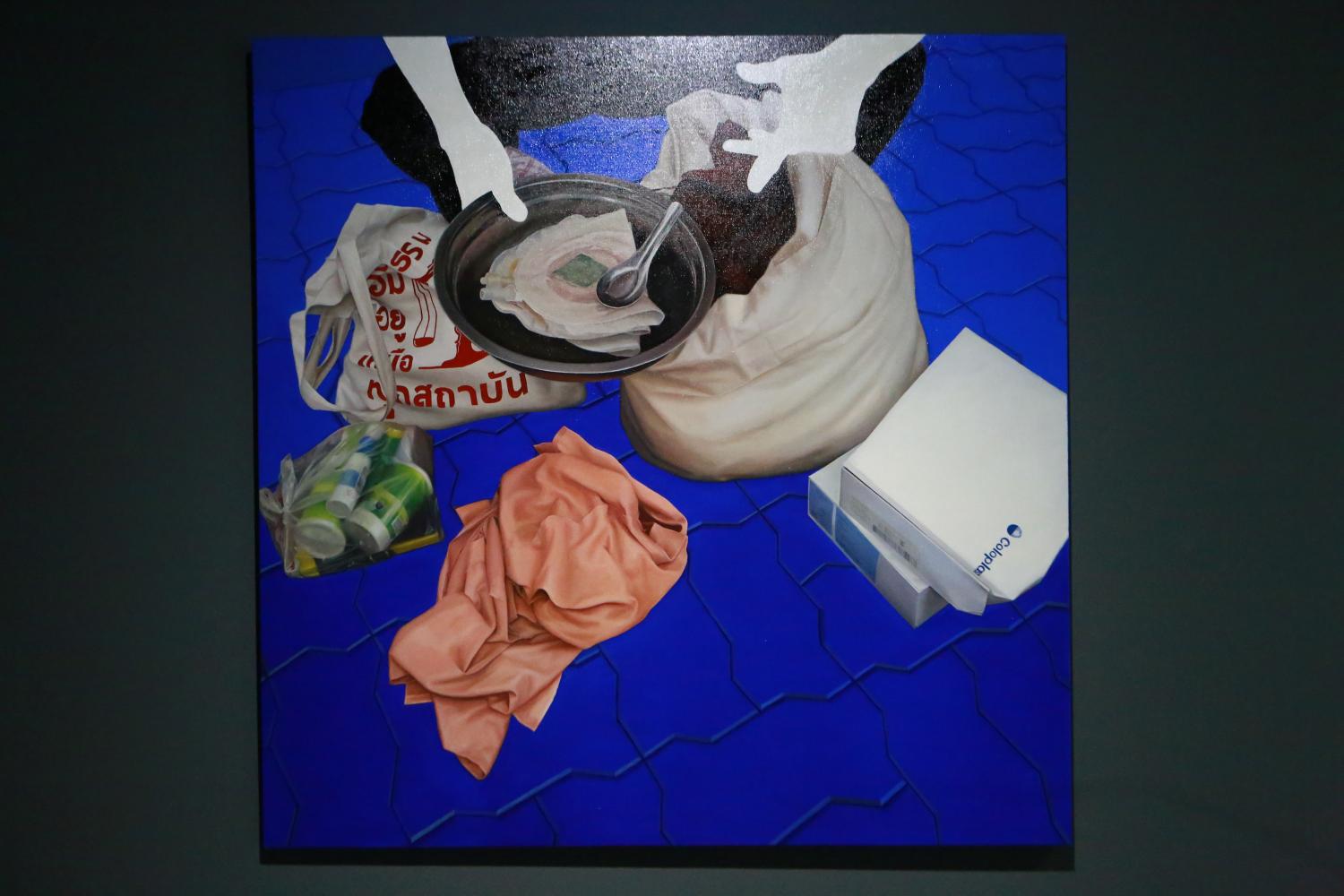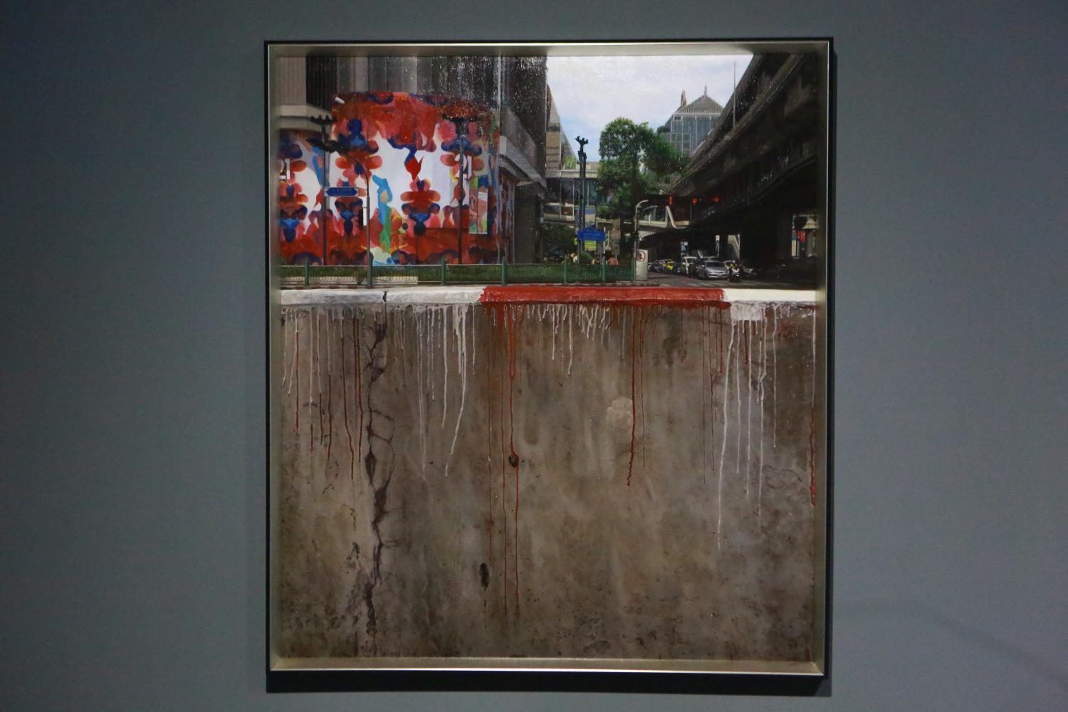 "There was an anti-government rally and protesters used paint in many areas, including this temple. Afterwards, their paintings were painted over and I took photos of the wall and then created this painting. In the painting, viewers can see untidy layers. The new version refers to an attempt to convert the wall back to its original condition but also attempts to hide something. However, traces of damage cannot be completely hidden," said Wittawat.
