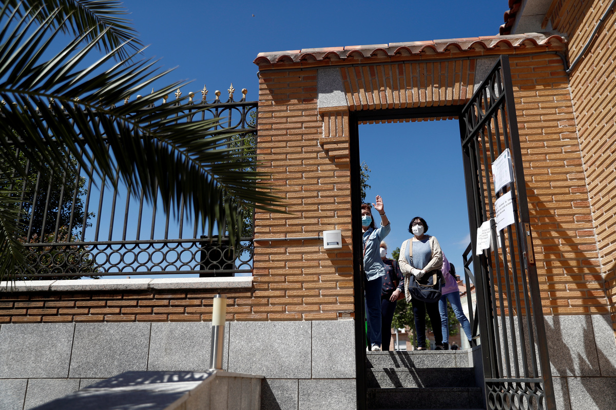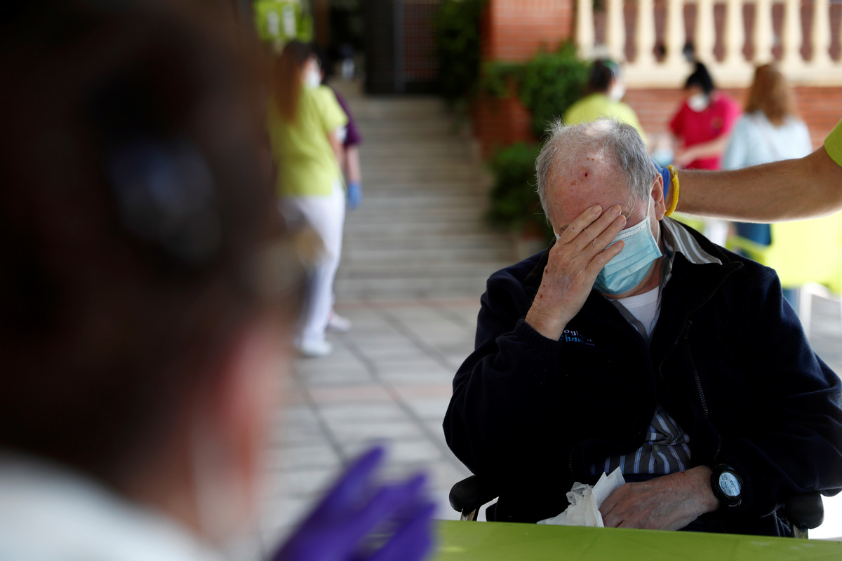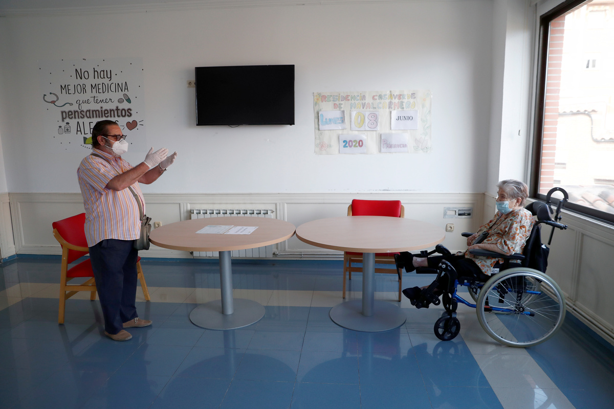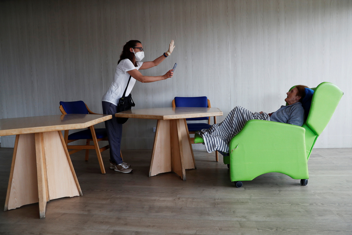 Carmen Aguilar blows a kiss to his son-in-law, who's waiting outside the nursing home on the first day family visits are resumed after three months amid the coronavirus disease (COVID-19) outbreak at the nursing home Centro Casaverde in Navalcarnero, outside Madrid, Spain June 8, 2020. REUTERS/Susana VeraVisitors wave at their family members as they wait to enter on the first day family visits are resumed after three months amid the coronavirus disease (COVID-19) outbreak at the nursing home Centro Casaverde in Navalcarnero, outside Madrid, Spain June 8, 2020. REUTERS/Susana VeraFlorentino Martinez gets emotional as he sees his wife Maria Emilia on the first day family visits are resumed after three months amid the coronavirus disease (COVID-19) outbreak at the nursing home Centro Casaverde in Navalcarnero, outside Madrid, Spain June 8, 2020. REUTERS/Susana VeraFelicidad Dominguez's daughter Bienvenida takes a picture of both of them on the first day family visits are resumed after three months amid the coronavirus disease (COVID-19) outbreak at the nursing home Centro Casaverde in Navalcarnero, outside Madrid, Spain June 8, 2020. REUTERS/Susana VeraAsela Escalante and her mother Josefina Viera keep social distance on the first day family visits are resumed after three months amid the coronavirus disease (COVID-19) outbreak at the nursing home Centro Casaverde in Navalcarnero, outside Madrid, Spain June 8, 2020. REUTERS/Susana VeraAngela Navas bids farewell to her sister Manuela Navas on the first day family visits are resumed after three months amid the coronavirus disease (COVID-19) outbreak at the nursing home Centro Casaverde in Navalcarnero, outside Madrid, Spain, June 8, 2020. REUTERS/Susana VeraJesus Mayo shows his mother Vicenta Abella her family members on the phone on the first day family visits are resumed after three months amid the coronavirus disease (COVID-19) outbreak at the nursing home Centro Casaverde in Navalcarnero, outside Madrid, Spain June 8, 2020. REUTERS/Susana VeraAsela Escalante pulls down her mask so her mother Josefina Viera can recognise her on the first day family visits are resumed after three months amid the coronavirus disease (COVID-19) outbreak at the nursing home Centro Casaverde in Navalcarnero, outside Madrid, Spain June 8, 2020. REUTERS/Susana VeraMarcelino Bazaga gets emotional as he sees his wife Ascension Acero on the first day family visits are resumed after three months amid the coronavirus disease (COVID-19) outbreak at the nursing home Centro Casaverde in Navalcarnero, outside Madrid, Spain June 8, 2020. REUTERS/Susana VeraVisitors keep social distancing as they get their tempearture checked on the first day family visits are resumed after three months amid the coronavirus disease (COVID-19) outbreak at the nursing home Centro Casaverde in Navalcarnero, outside Madrid, Spain, June 8, 2020. REUTERS/Susana VeraPedro Sanchez gets emotional as his wife Guadalupe Jimenez (reflected on the window) talks to him from a distance, on the first day family visits are resumed after three months amid the coronavirus disease (COVID-19) outbreak at the nursing home Centro Casaverde in Navalcarnero, outside Madrid, Spain, June 8, 2020. REUTERS/Susana VeraCarmen Gonzalez talks to her daughter from a distance on the first day family visits are resumed after three months amid the coronavirus disease (COVID-19) outbreak at the nursing home Centro Casaverde in Navalcarnero, outside Madrid, Spain, June 8, 2020. REUTERS/Susana VeraMarisa Garrido takes pictures of her mother Luisa Gomez as they keep social distancing on the first day family visits are resumed after three months amid the coronavirus disease (COVID-19) outbreak at the nursing home Centro Casaverde in Navalcarnero, outside Madrid, Spain, June 8, 2020. REUTERS/Susana VeraSocial worker, Tamara Corona, checks the temperature of a visitor on the first day family visits are resumed after three months amid the coronavirus disease (COVID-19) outbreak at the nursing home Centro Casaverde in Navalcarnero, outside Madrid, Spain, June 8, 2020. REUTERS/Susana Vera