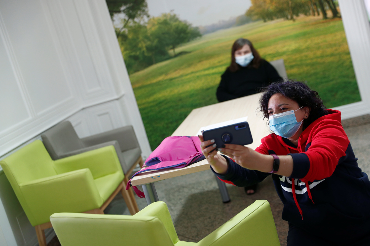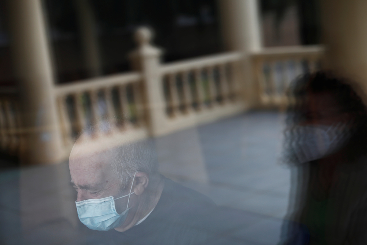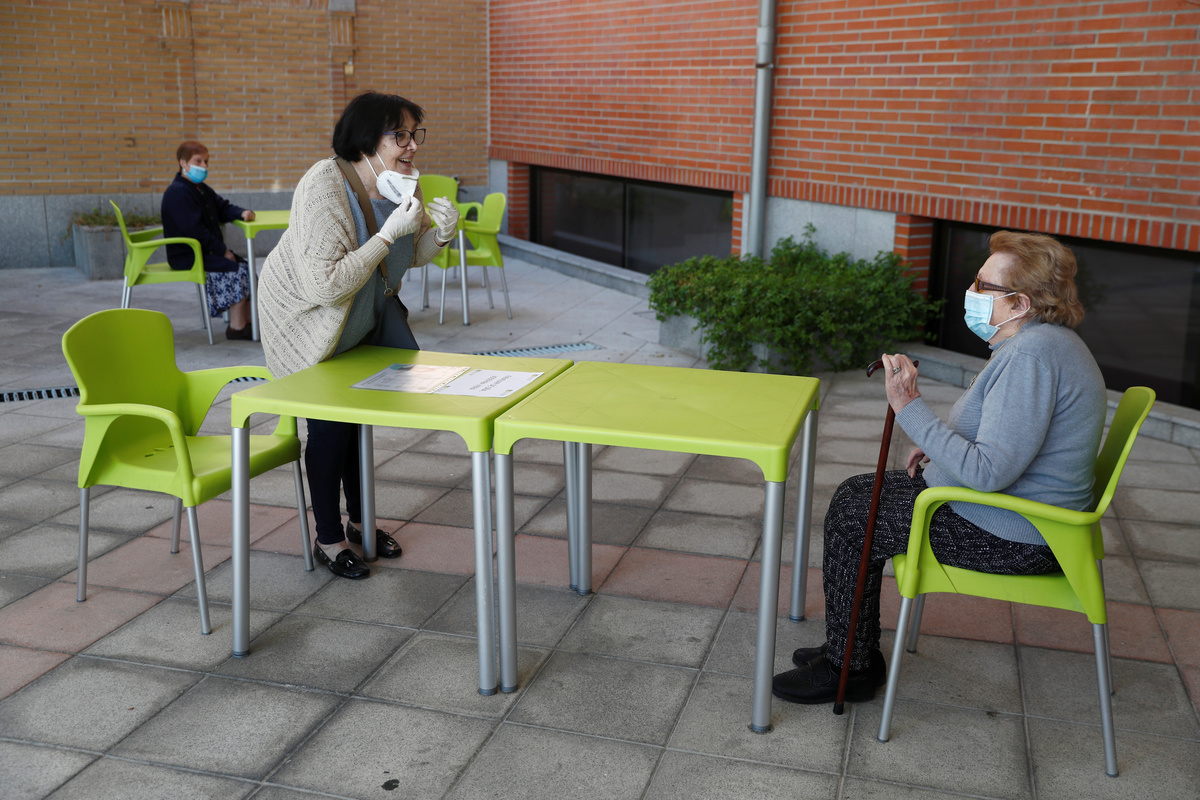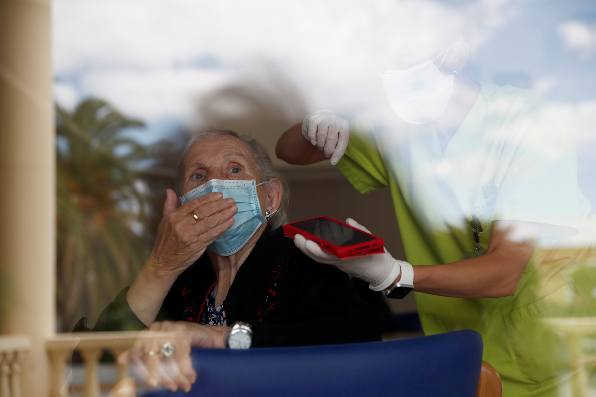 Carmen Aguilar blows a kiss to his son-in-law, who's waiting outside the nursing home on the first day family visits are resumed after three months amid the coronavirus disease (COVID-19) outbreak at the nursing home Centro Casaverde in Navalcarnero, outside Madrid, Spain June 8, 2020. REUTERS/Susana VeraVisitors wave at their family members as they wait to enter on the first day family visits are resumed after three months amid the coronavirus disease (COVID-19) outbreak at the nursing home Centro Casaverde in Navalcarnero, outside Madrid, Spain June 8, 2020. REUTERS/Susana VeraFlorentino Martinez gets emotional as he sees his wife Maria Emilia on the first day family visits are resumed after three months amid the coronavirus disease (COVID-19) outbreak at the nursing home Centro Casaverde in Navalcarnero, outside Madrid, Spain June 8, 2020. REUTERS/Susana VeraFelicidad Dominguez's daughter Bienvenida takes a picture of both of them on the first day family visits are resumed after three months amid the coronavirus disease (COVID-19) outbreak at the nursing home Centro Casaverde in Navalcarnero, outside Madrid, Spain June 8, 2020. REUTERS/Susana VeraAsela Escalante and her mother Josefina Viera keep social distance on the first day family visits are resumed after three months amid the coronavirus disease (COVID-19) outbreak at the nursing home Centro Casaverde in Navalcarnero, outside Madrid, Spain June 8, 2020. REUTERS/Susana VeraAngela Navas bids farewell to her sister Manuela Navas on the first day family visits are resumed after three months amid the coronavirus disease (COVID-19) outbreak at the nursing home Centro Casaverde in Navalcarnero, outside Madrid, Spain, June 8, 2020. REUTERS/Susana VeraJesus Mayo shows his mother Vicenta Abella her family members on the phone on the first day family visits are resumed after three months amid the coronavirus disease (COVID-19) outbreak at the nursing home Centro Casaverde in Navalcarnero, outside Madrid, Spain June 8, 2020. REUTERS/Susana VeraAsela Escalante pulls down her mask so her mother Josefina Viera can recognise her on the first day family visits are resumed after three months amid the coronavirus disease (COVID-19) outbreak at the nursing home Centro Casaverde in Navalcarnero, outside Madrid, Spain June 8, 2020. REUTERS/Susana VeraMarcelino Bazaga gets emotional as he sees his wife Ascension Acero on the first day family visits are resumed after three months amid the coronavirus disease (COVID-19) outbreak at the nursing home Centro Casaverde in Navalcarnero, outside Madrid, Spain June 8, 2020. REUTERS/Susana VeraVisitors keep social distancing as they get their tempearture checked on the first day family visits are resumed after three months amid the coronavirus disease (COVID-19) outbreak at the nursing home Centro Casaverde in Navalcarnero, outside Madrid, Spain, June 8, 2020. REUTERS/Susana VeraPedro Sanchez gets emotional as his wife Guadalupe Jimenez (reflected on the window) talks to him from a distance, on the first day family visits are resumed after three months amid the coronavirus disease (COVID-19) outbreak at the nursing home Centro Casaverde in Navalcarnero, outside Madrid, Spain, June 8, 2020. REUTERS/Susana VeraCarmen Gonzalez talks to her daughter from a distance on the first day family visits are resumed after three months amid the coronavirus disease (COVID-19) outbreak at the nursing home Centro Casaverde in Navalcarnero, outside Madrid, Spain, June 8, 2020. REUTERS/Susana VeraMarisa Garrido takes pictures of her mother Luisa Gomez as they keep social distancing on the first day family visits are resumed after three months amid the coronavirus disease (COVID-19) outbreak at the nursing home Centro Casaverde in Navalcarnero, outside Madrid, Spain, June 8, 2020. REUTERS/Susana VeraSocial worker, Tamara Corona, checks the temperature of a visitor on the first day family visits are resumed after three months amid the coronavirus disease (COVID-19) outbreak at the nursing home Centro Casaverde in Navalcarnero, outside Madrid, Spain, June 8, 2020. REUTERS/Susana Vera