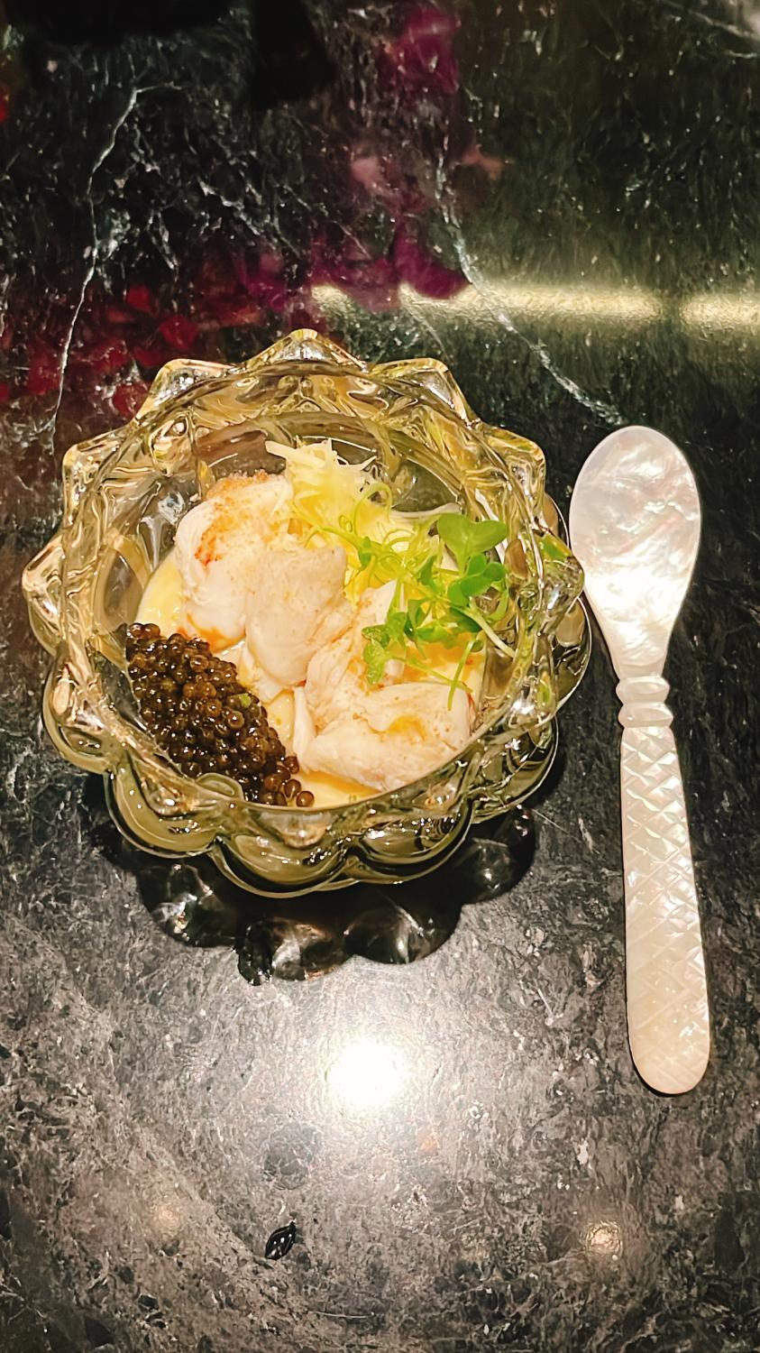 A Thai classic often seen on most fine dining menus has been done a tad differently here. The tangmo pla heang comprises compressed watermelon, som saa and watermelon jelly, dashi jelly with dried tuna, ikura cured with fish salt, garnished with watermelon flowers and rosella leaf. A good dish leading up to the next Japanese-inspired course of chawanmushi, except in this case the crab sits atop a coconut relish with young ginger, scallions and caviar. Served with a Mother of Pearl spoon, it is a rather decadent course with lashings of black truffle shaved onto it.