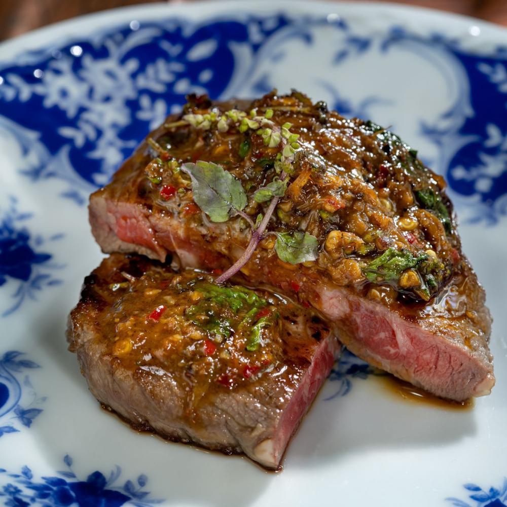 One of my favourite Thai seaside dishes is goong chae nam pla and at Lahnyai Nusara it is served with prawns from Ranong, cold coriander water with chilli and mint oil, bitter gourd candied with palm sugar and garnished with rose apple flower. A soul-warming soup is next with abalone and three types of potato. The abalone stock is infused with basil, reminiscent of a tom jiew from the Rama V era. A spicy relish made with shrimp paste, coconut cream and foam from the South is mixed tableside and served with seasonal vegetables, Nusara's signature peanut chilli relish, and a phrik naam pla, made with grilled chillies.