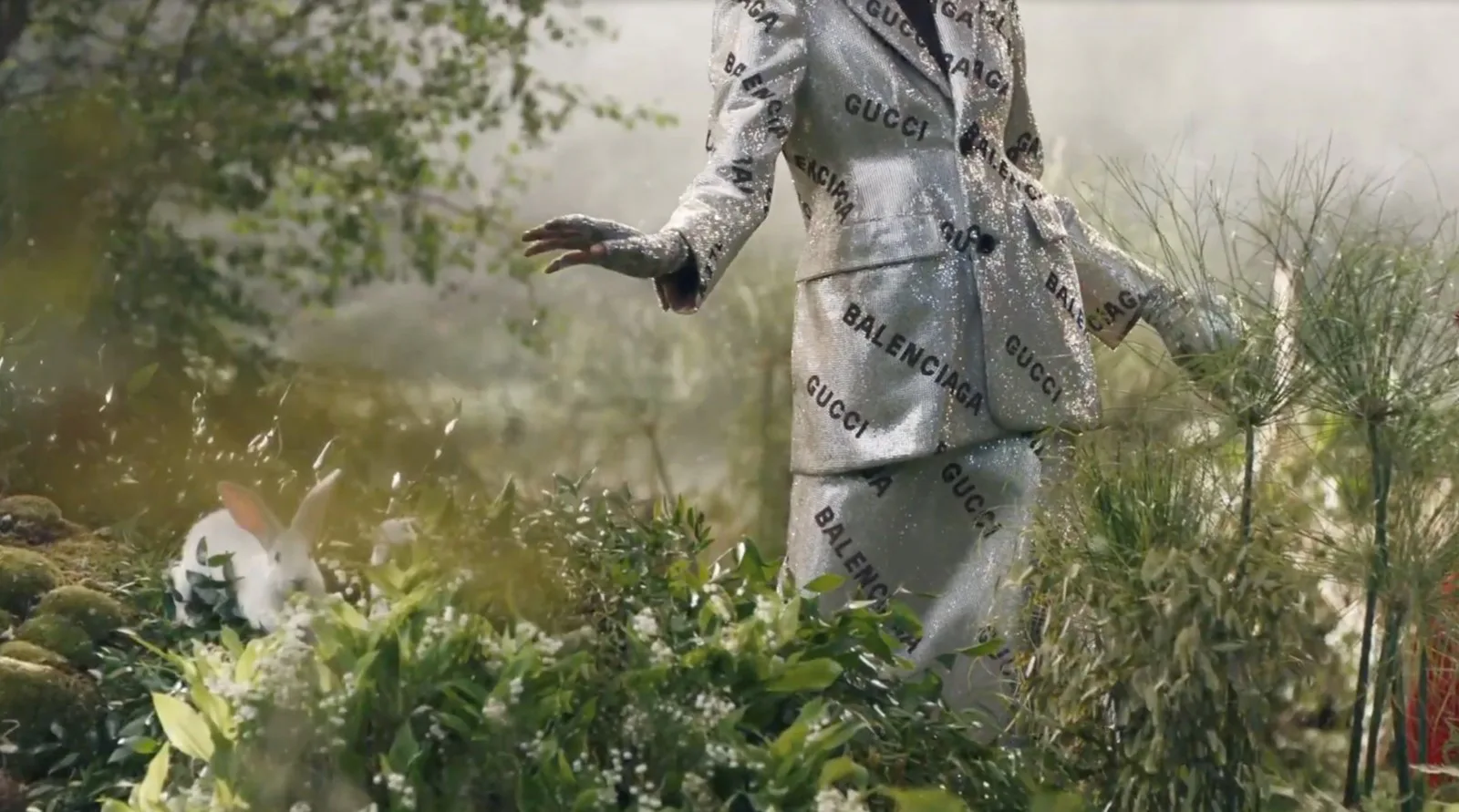 While half of the show took on a modern, runway look, the second half added a whimsical touch to the collection. Square-shouldered blazers and crystal-encrusted hourglass suits shine in the first setting, while sequined trench coats and crisp white sets contribute to the latter fairytale ambiance. Gucci also enlisted the help of celebrities like Miley Cyrus to debut the collaborative capsule on social media, where the singer can be seen frolicking among mushrooms in a sparkly green branded jacket and large branded sunglasses.