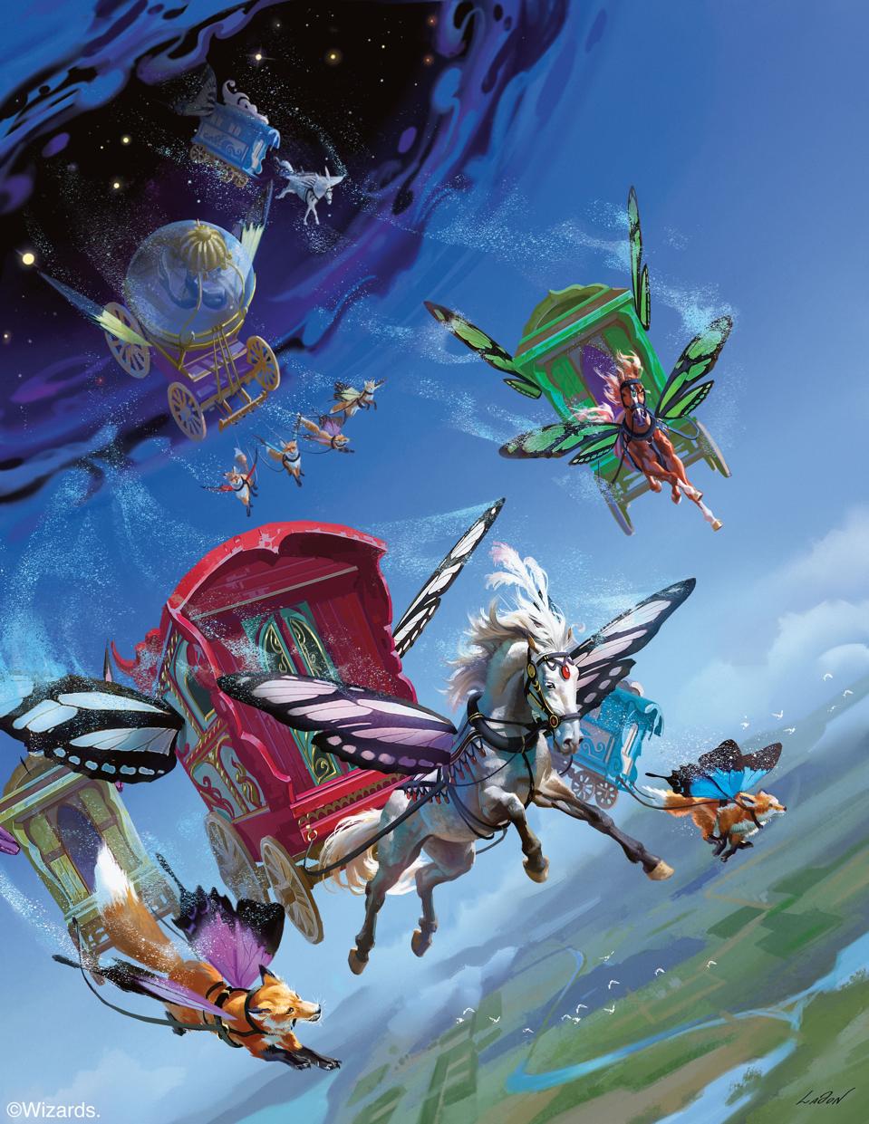 “Apart from being evocatively written,” said Chris Perkins, D&D Game Design Architect, “Bradbury’s novel deals with the theme of time—which is also a theme in The Wild Beyond the Witchlight. The novel’s autumnal setting reinforces that theme, as does its carnival. Our carnival isn’t as menacing as Bradbury’s, but the Feywild certainly has a sinister edge to it (although there’s plenty of whimsy there, too).”