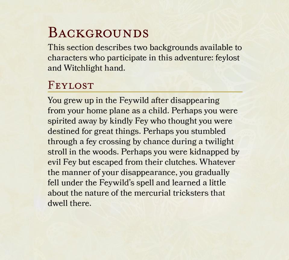 “The feylost background was inspired by the classic fairy tale trope of the Feywild intruding upon the natural world,” said Perkins. “If you want to play a character who spent much of their youth in the Feywild, this is a great background to choose. Maybe you wandered into the Feywild as a youth, or maybe a Fey creature lured you it. Basically, you’ve lived in two worlds, which is a fun idea to play with.”