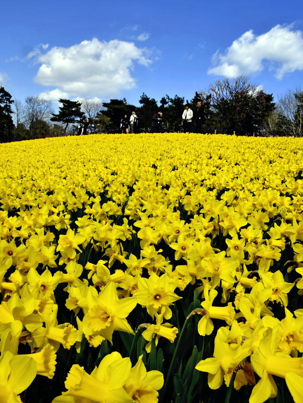 About 21,000 yellow daffodils in full bloom catch visitors' eye at the Hitachi Seaside Park in Hitachinaka, Ibaraki Prefecture. The daffodils, an early-flowering species, spread out like a carpet across a hilly area of about 600 square meters.