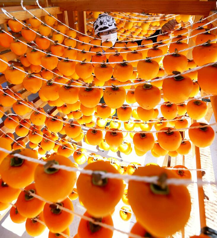 A man hangs up persimmons Tuesday at the Inaka Michi no Eki Yashimaya store in Marumori, Miyagi Prefecture, where they will dry for about 1-1/2 months to remove their astringency. Temperatures fell below zero more often than usual in Marumori in the spring, reducing the persimmon crop. As a result, the town is expected to only produce about 10% of its usual output of dried persimmons.