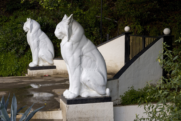 But then, just where the highway turns from four lanes to two and begins its ascent into the Santa Cruz Mountains, you notice something bizarre on the right, just off the road, in a passing blur. Statues of two 8-feet-tall white cats sit on pedestals in front of a gated driveway and dark woods.