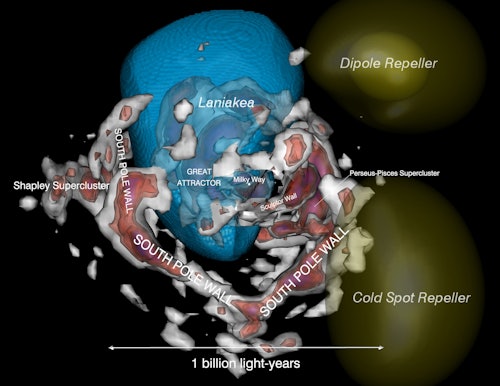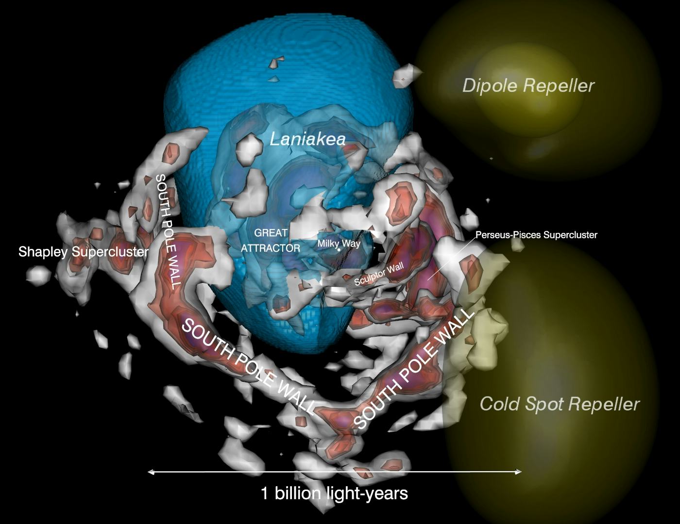 Pomarède’s team created a 3D map to visualize the Milky Way's surroundings, labeling key locations, the South Pole Wall, and our small galaxy at the center of it all.